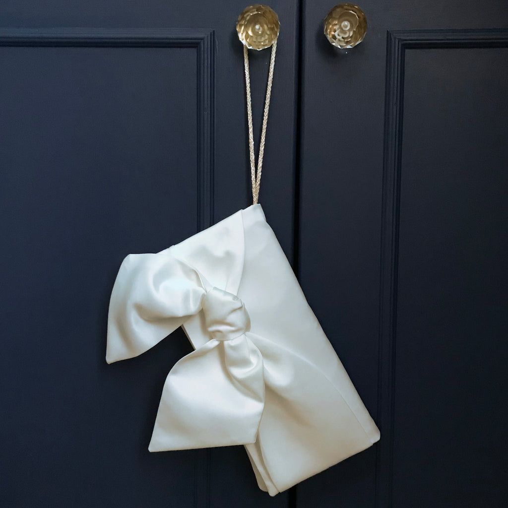 The knotted detail is made from a sumptuous satin which drapes and hangs perfectly. This is stitched in to the seam of the front flap, which folds over and fastens underneath with a mag-snap under each corner.